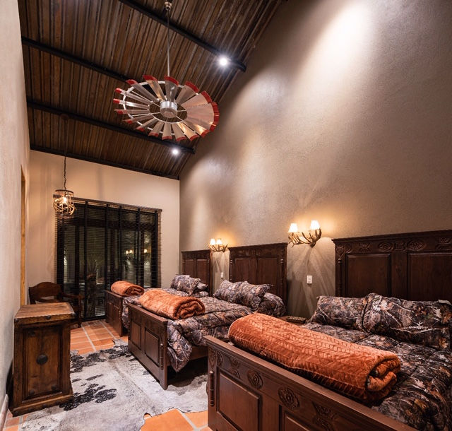 Guests at Rancho La Bota stay in our beautifully crafted Old Mexico–style lodge, designed to deliver comfort, authenticity, and relaxation after a day in the field. The lodge features 20 spacious bedrooms, comfortably accommodating up to 40 guests, making it ideal for groups and private hunting parties.